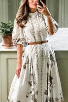 Stand Collar Puff Sleeves Printed Swing Midi Shirt Dress