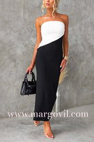 Enhance your style with our Strapless Tube Back Slit Color Block Bodycon Midi Dress. The strapless design and back slit add a touch of elegance while the bodycon fit flatters your figure. Perfect for any occasion, this dress is a must-have addition to your wardrobe.