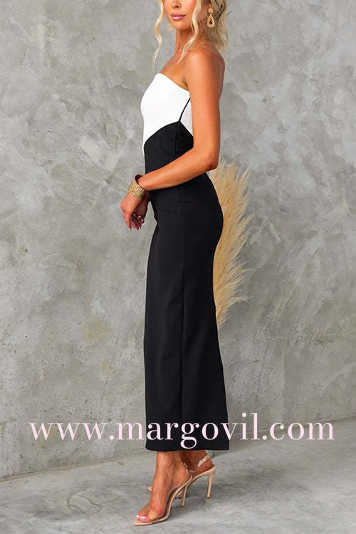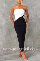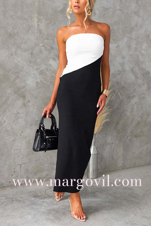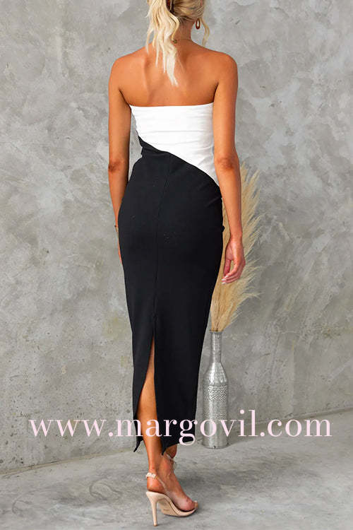 Strapless Tube Back Slit Color Block Bodycon Midi Dress