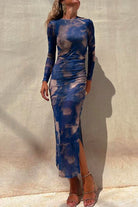 Chicest Long Sleeve Ruched Side Slit Tie Dye Maxi Dress