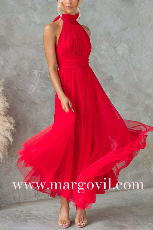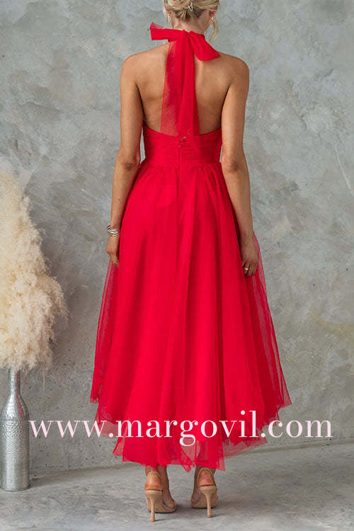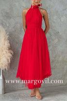 Indulge in the delicate elegance of our Margovil Bow Knot Halter Open Back Tulle Maxi Dress. With a beautiful bow knot halter neck and an open back, this dress is perfect for any special occasion. The flowing tulle fabric will make you feel like a princess, while the open back adds a touch of sophistication. Elevate your style and turn heads with this stunning maxi dress.
