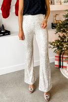 Introducing these glamorous high waist bell bottom silver sequin pants. The perfect blend of shimmering sequins, flared bell bottoms, and a high waist will make you look fabulous. The pants feature a stretchy waistband with adjustable drawstrings. Feel stunning and sparkling in these eye-catching bottoms.