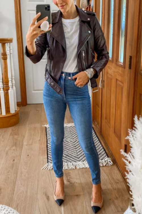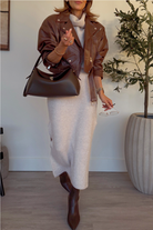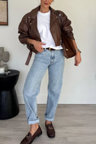 Margovil Vintage Lapel Zip Up Faux Leather Moto Jacket