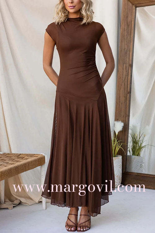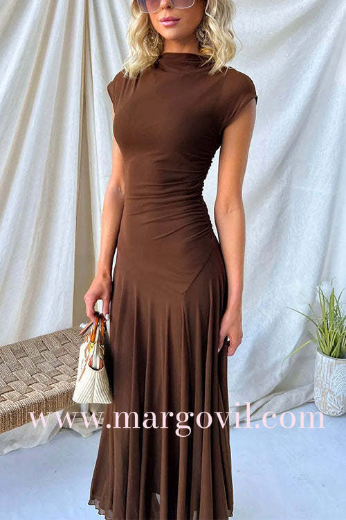 Mockneck Cap Sleeves Ruched Mesh Maxi Dress