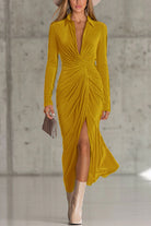 Lapel V Neck Long Sleeves Ruched Slit Velvet Midi Dress