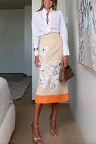 Step into confidence with the Margovil High Rise Color Block Floral Print Pencil Midi Skirt. Its high-rise design sculpts your figure while the pencil cut offers a sleek, elegant silhouette. The combination of bold color blocks and delicate floral prints creates a unique statement piece, ideal for elevating your wardrobe from office meetings to weekend outings. Experience style and comfort perfectly blended in one skirt.