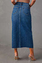 Margovil High Rise Raw Hem Slit Front Denim Midi Skirt