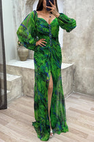 Margovil Off Shoulder Rhinestones Detail Printed Slit Pleated Maxi Dress