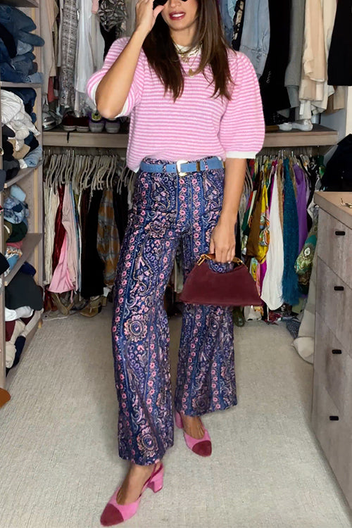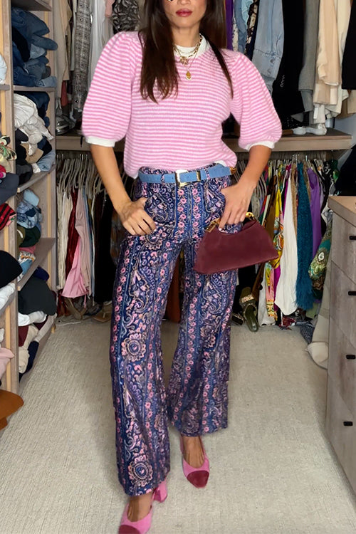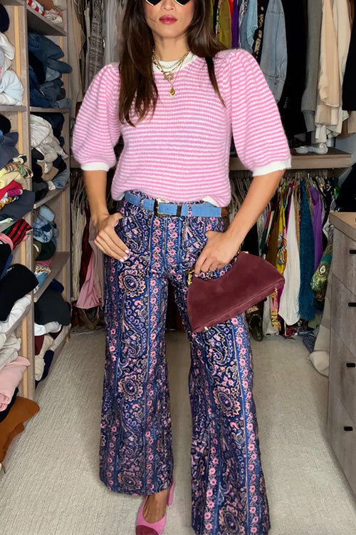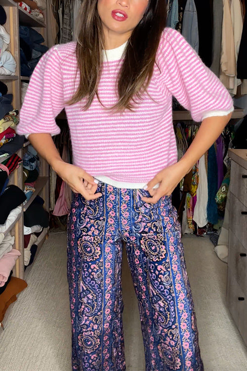Crewneck Puff Half Sleeves Striped Pullover Sweater