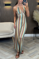 Margovil Halter V Neck Backless Color Block Crochet Maxi Dress