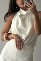 Elevate your style with Margovil's exquisite sleeveless satin top, a wardrobe essential that radiates sophistication. The striking halter and cowl neckline combination creates an alluring neckline that flatters while maintaining an air of refined elegance. Luxuriously crafted from premium satin, this piece drapes gracefully and catches light beautifully, adding dimension to any outfit. Perfect for professional environments or special occasions, it pairs effortlessly with everything from crisp blazers to flowing skirts. Own a versatile investment piece that transforms your look with understated glamour and timeless appeal.