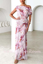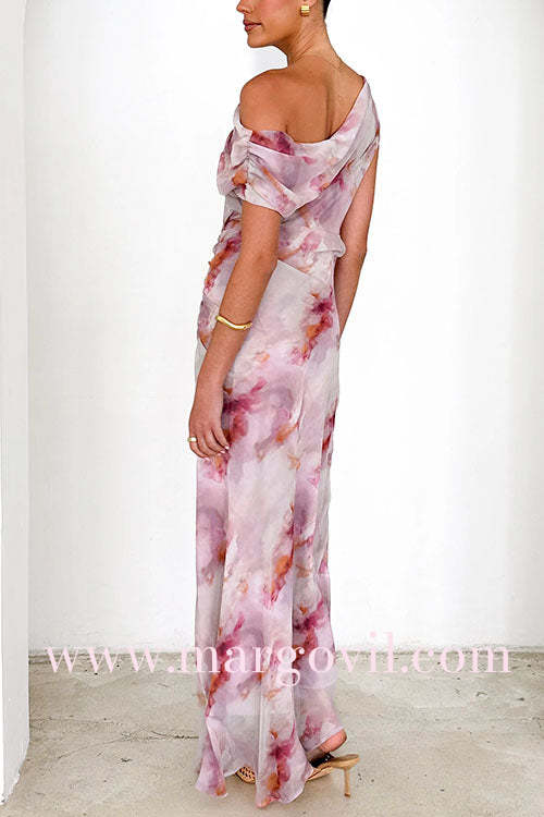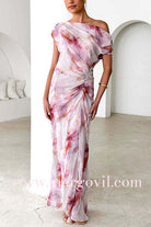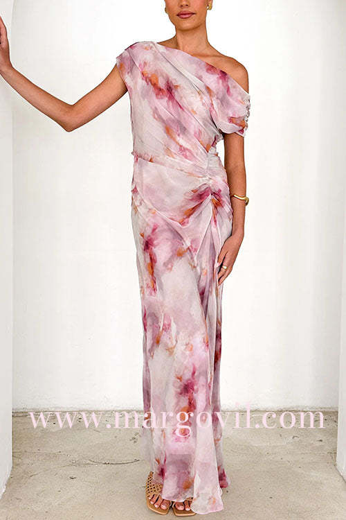 Asymmetric One Shoulder Ruched Waist Print Maxi Dress