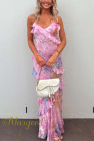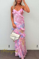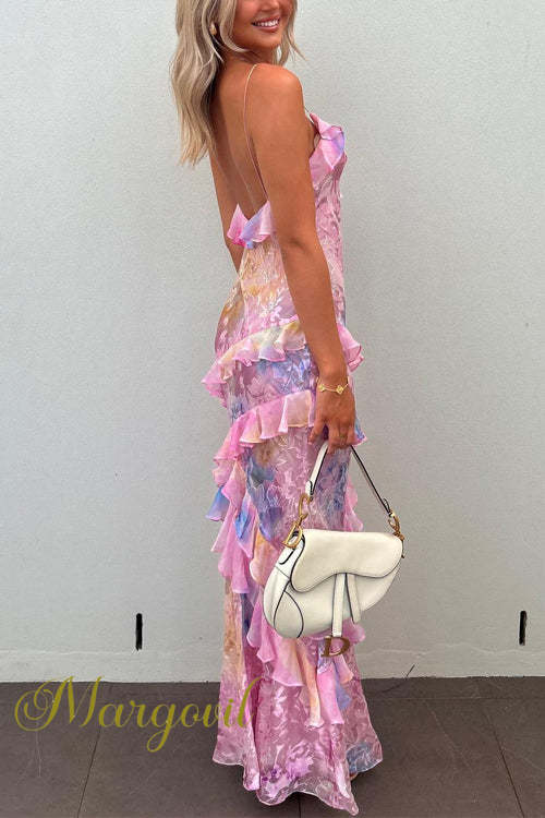 Margovil Ruffle Trim Open Back Printed Maxi Cami Dress