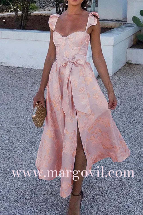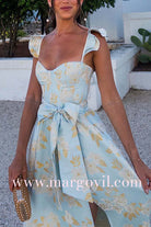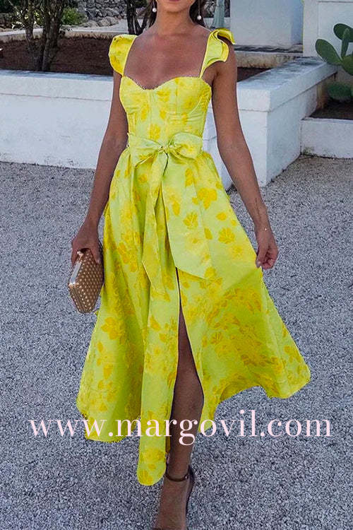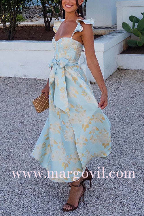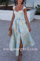 Margovil Ruffled Shoulder Bow Knot Waist Slit Printed Vintage Party Dress