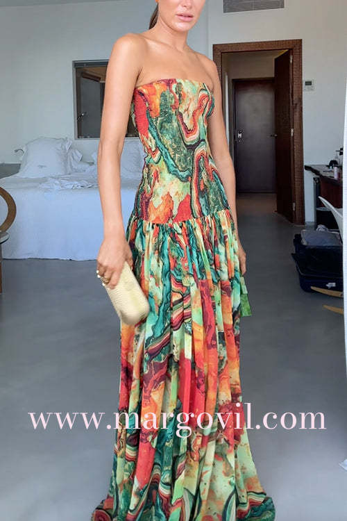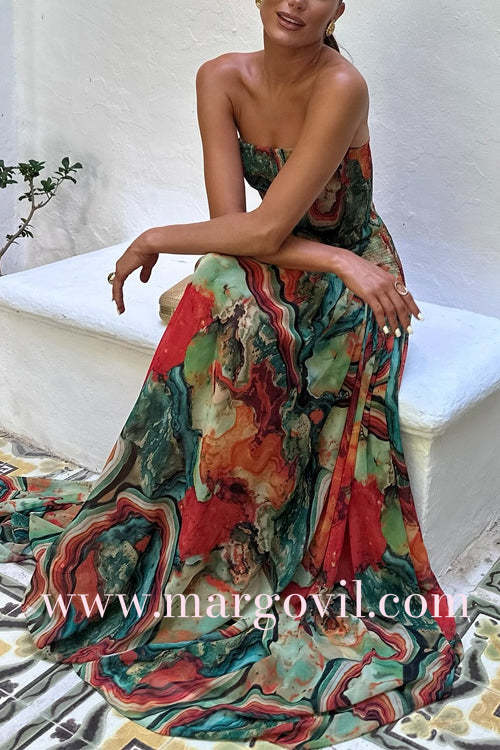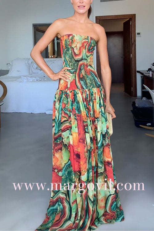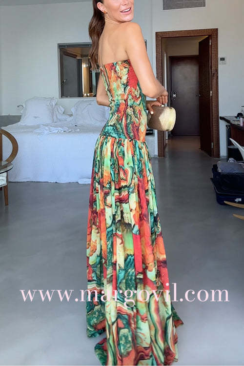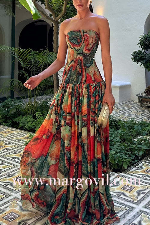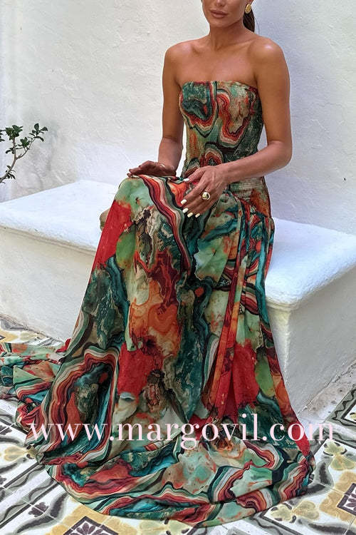 Strapless Smocked Ombre Print Swing Maxi Dress