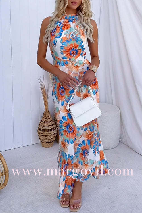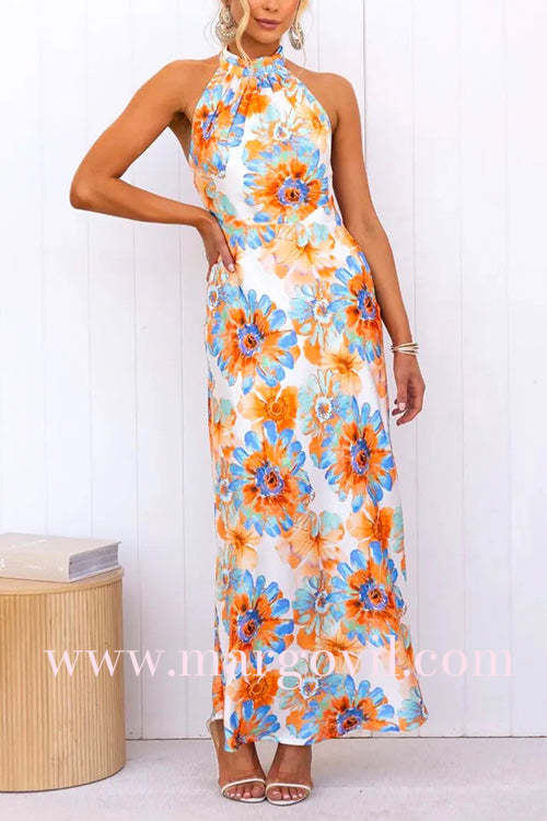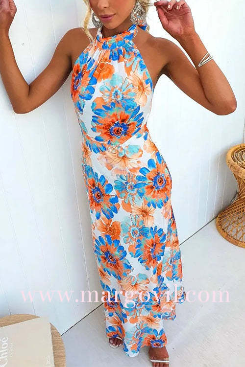 Tie Knot Halter Backless Floral Printed Maxi Holiday Dress