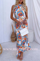 Turn heads in our Tie Knot Halter Backless Floral Printed Maxi Holiday Dress! Featuring a halter neckline with tie knot and a beautiful and vibrant floral print, this dress is perfect for upcoming summer evenings. Lovely and lightweight, you'll be sure to look and feel amazing in this stunning maxi holiday dress.