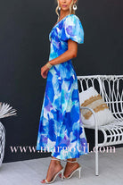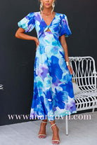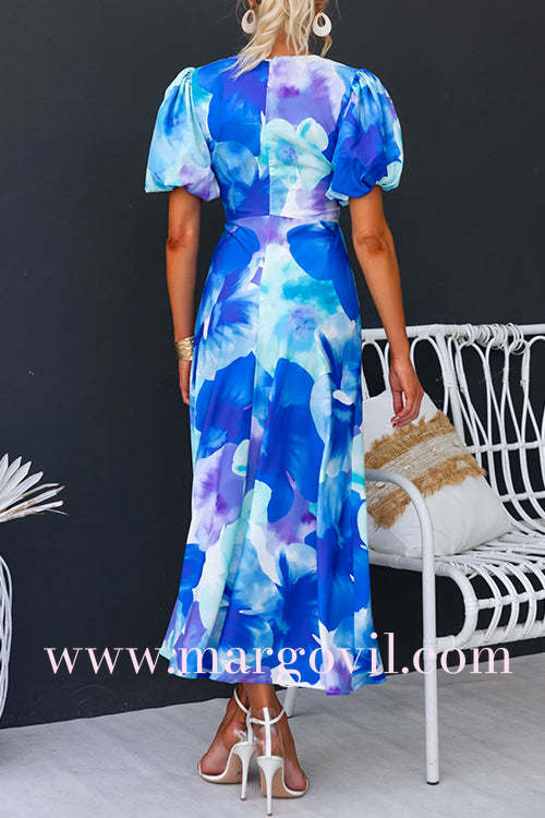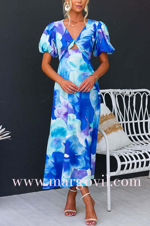 V Neck Twist Front Puff Sleeves Floral Print Midi Dress