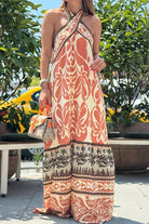 Criss Cross Halter Open Back Printed Maxi Vacation Dress