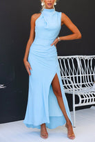 Sleeveless Asymmetric Shoulder Waisted Slit Maxi Dress