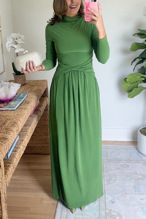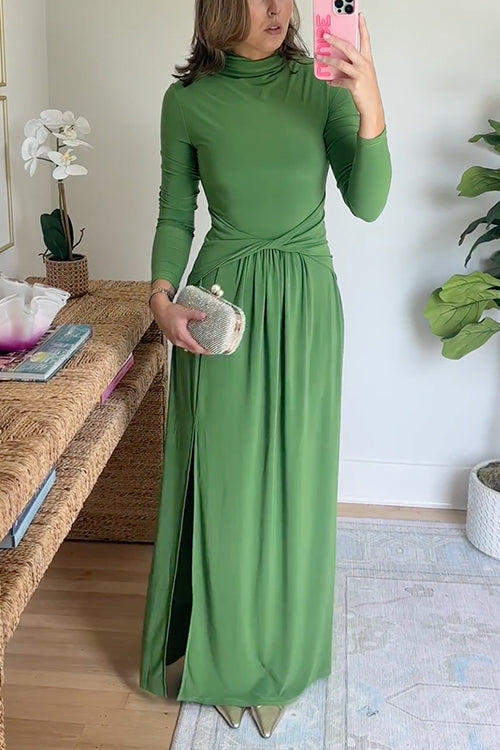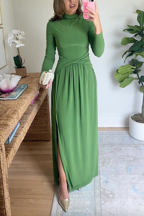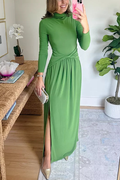 Elevate your style with the High Neck Long Sleeves Side Slit Maxi Dress. Featuring a sleek high neckline and elegant long sleeves, this dress offers a refined silhouette. The side slit adds a captivating touch of movement and sophistication, making it perfect for special occasions or chic evenings out. Experience effortless grace and confidence in this timeless maxi dress.