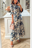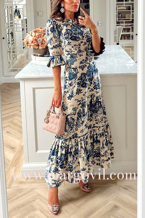 Bell Sleeves Waisted Landscape Printed Maxi Ruffle Dress
