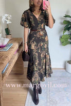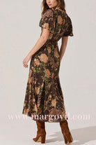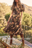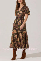 Elevate your style with the V Neck Puff Short Sleeves Floral Print Midi Dress. Its elegant V neckline and charming puff sleeves create a flattering, feminine silhouette, while the vibrant floral print adds a fresh, eye-catching appeal. Perfectly tailored to midi length, this dress transitions seamlessly from day to night, making it an essential piece for your wardrobe that combines comfort with timeless elegance.