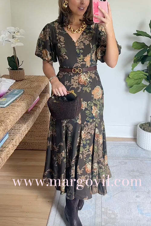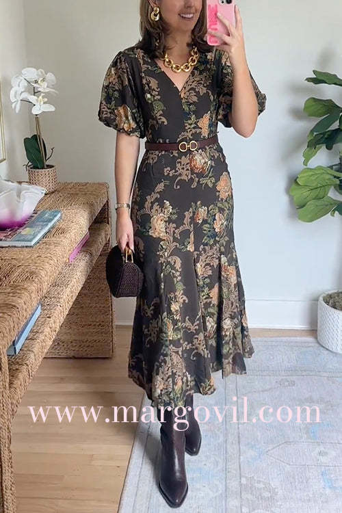 V Neck Puff Short Sleeves Floral Print Midi Dress