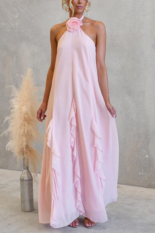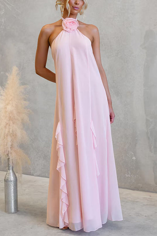 Halter Neck Open Back Ruffle Trim Maxi Dress