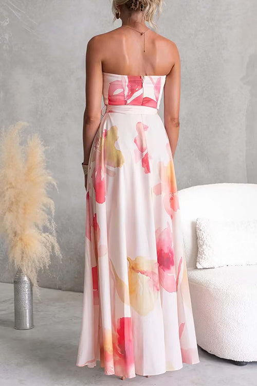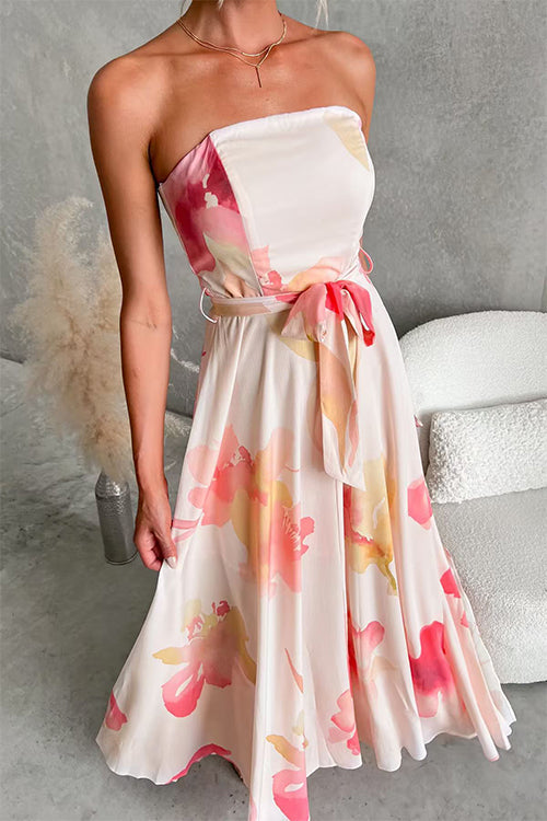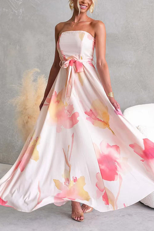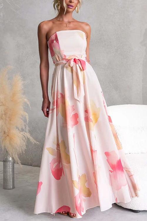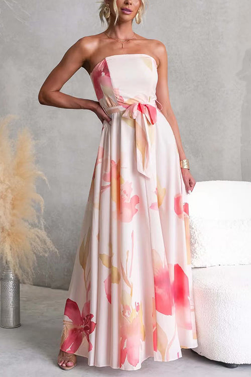 Strapless Tube Tie Waist Floral Print Maxi Dress