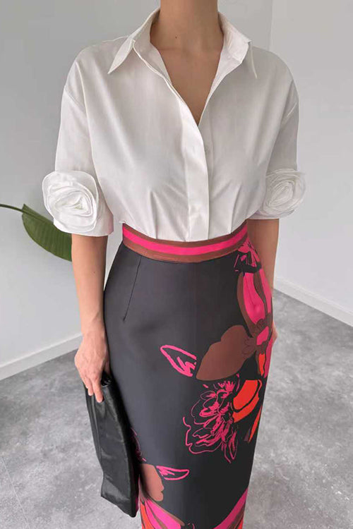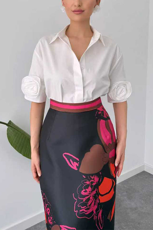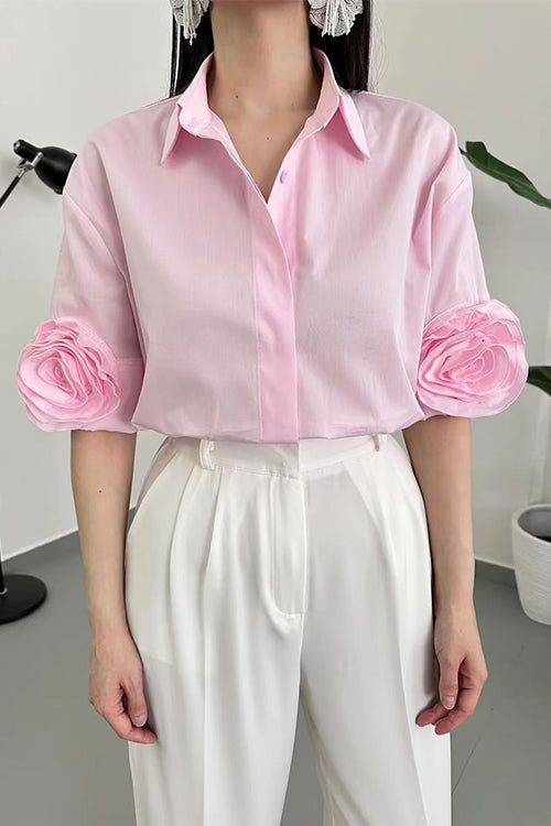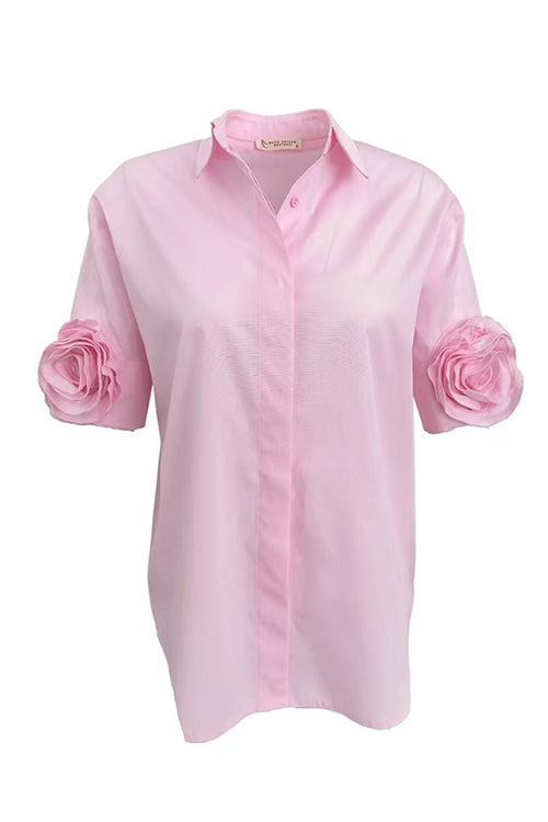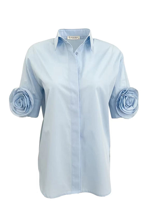 Lapel Short Sleeves Button Up Flower Detail Shirt