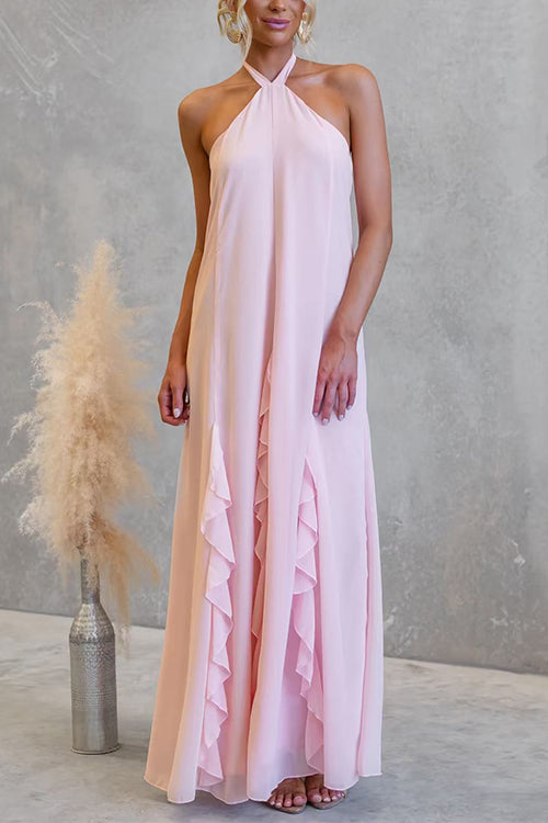 Halter Neck Open Back Ruffle Trim Maxi Dress