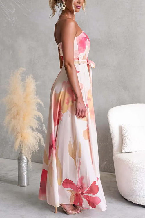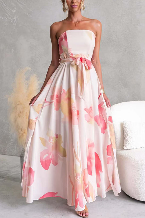 Strapless Tube Tie Waist Floral Print Maxi Dress