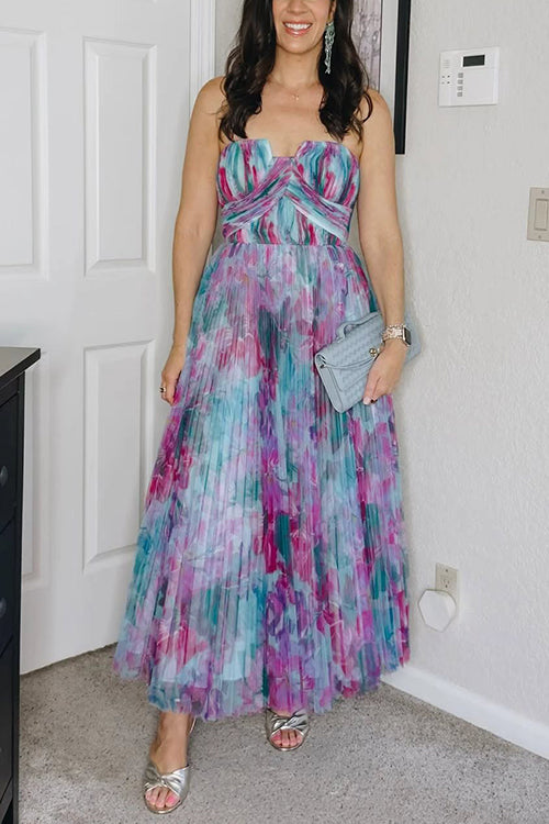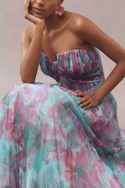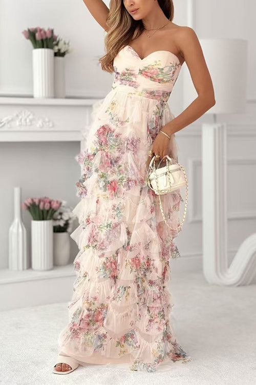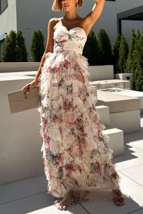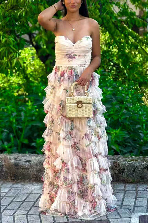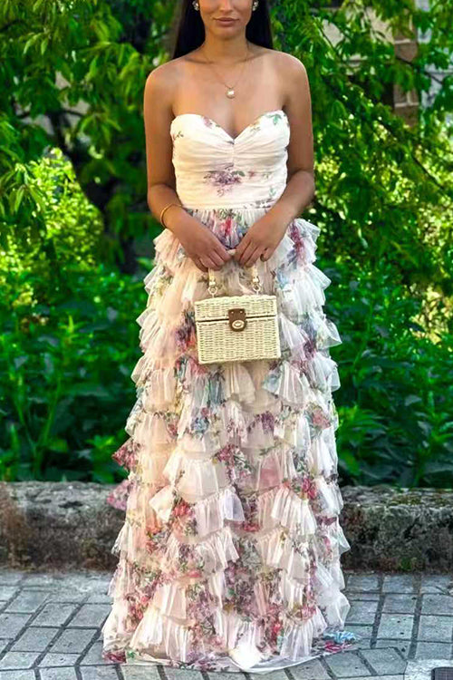 Strapless Floral Print Ruffle Layered Maxi Dress