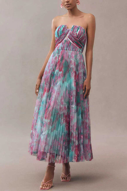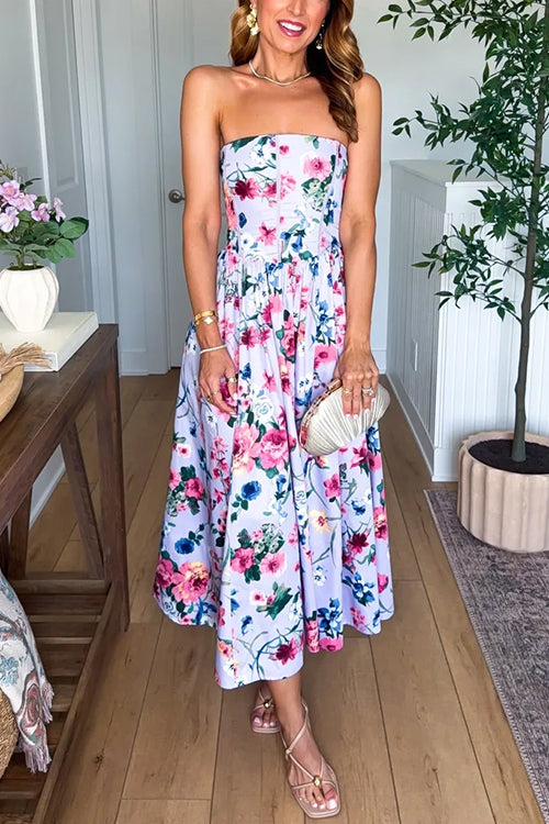 Strapless Tube Back Lace-up Floral Print Midi Dress