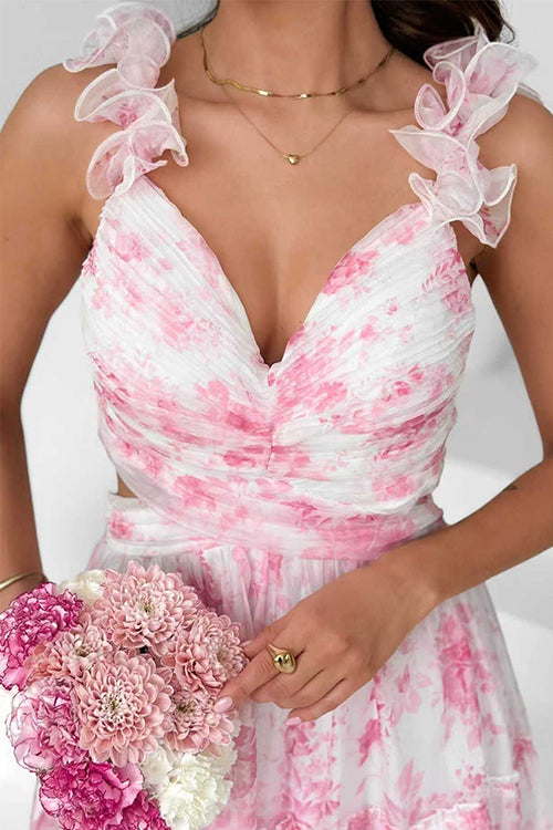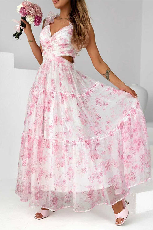 V Neck Sleeveless Cut Out Waist Floral Print Ruffle Maxi Dress
