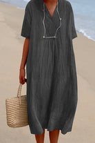 Margovil V Neck Short Sleeve Baggy Cotton Linen Midi Dress