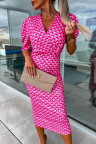 Margovil Wrap V Neck Puff Sleeves Printed Midi Bodycon Dress