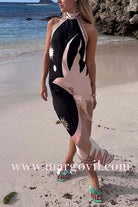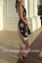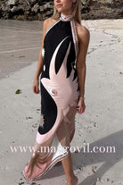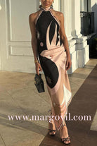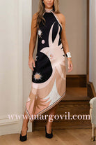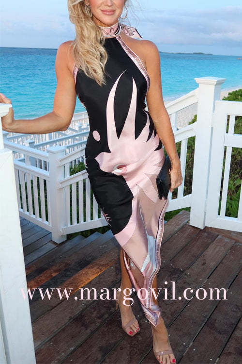 Margovil Halter Neck Open Back Asymmetric Hem Printed Satin Midi Dress