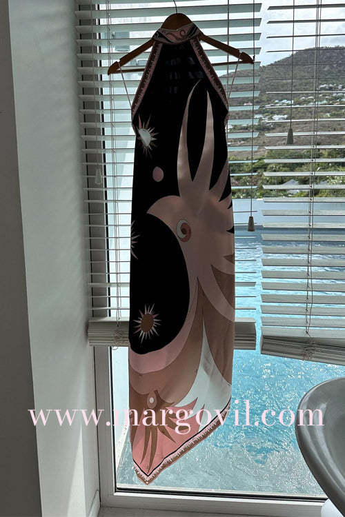 • Make a striking impression with the Margovil halter neck midi dress, crafted from luxurious printed satin. Its open back and asymmetric hem create a unique silhouette that blends elegance with contemporary style. Perfect for special occasions, this dress highlights your confidence and grace.