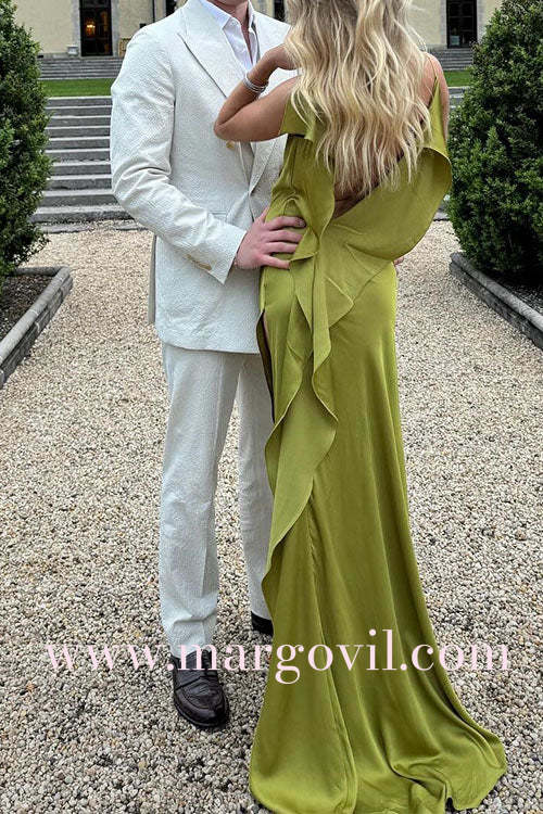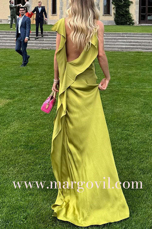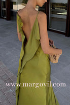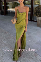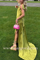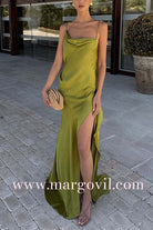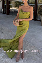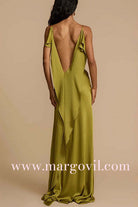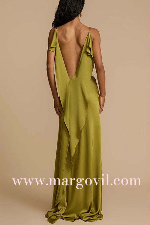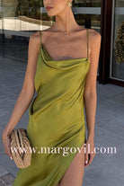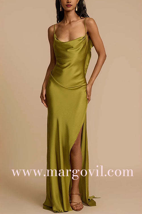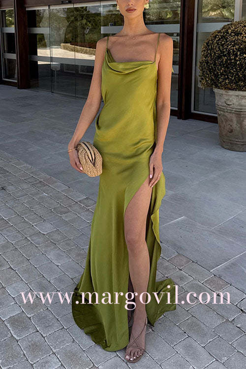 Margovil High Slit Back Drape Cascading Satin Maxi Cami Dress
