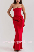 Elevate your style with our Margovil Strapless Ruched Satin Splice Bodycon Maxi Dress! Show off your beautiful curves with the bodycon silhouette and flattering ruched details. The satin splice adds a touch of luxury, perfect for any formal event. Look and feel confident with this stunning dress.