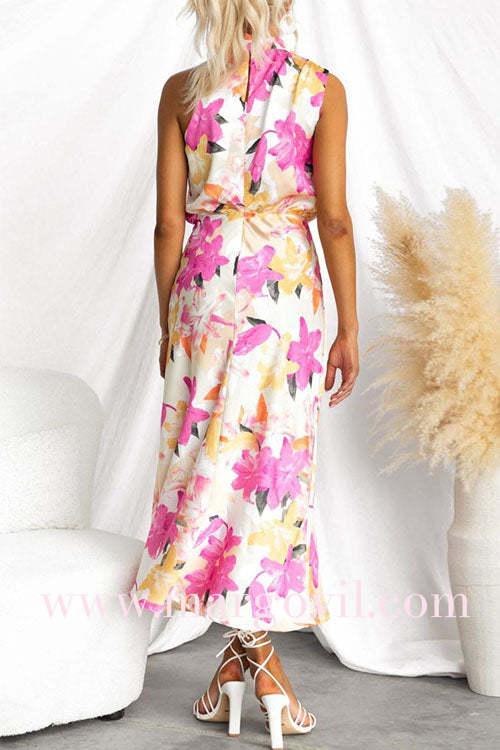 Mockneck Sleeveless Floral Print Satin Maxi Dress