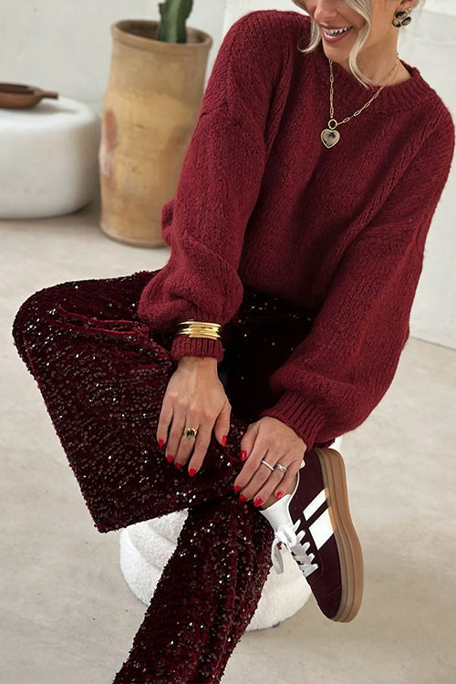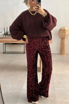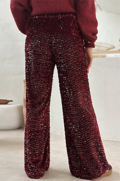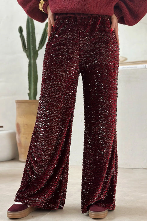 • Elevate your evening wear with these stunning high-rise sparkly sequin wide-leg pants. Designed to dazzle, the all-over sequin embellishment reflects light beautifully, ensuring you're the center of attention at any event. The high-rise cut flatters your figure while the flowing wide-leg silhouette offers unrestricted comfort and movement. Whether you're heading to a night out, celebration, or special occasion, these pants deliver glamour and confidence in one showstopping piece. Style them with a sleek top to let the sequins take center stage.