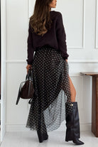 • Make a statement with this captivating maxi skirt featuring charming polka dots on luxurious tulle fabric. The adjustable drawstring waist provides a personalized fit that adapts to your body, ensuring comfort without compromise. This versatile piece transitions seamlessly from daytime elegance to evening glamour, offering endless styling possibilities with your favorite tops and accessories. The flowing silhouette creates a flattering drape that celebrates movement and grace. Whether you're attending a special event or elevating your everyday look, this skirt delivers the sophistication and charm you deserve.