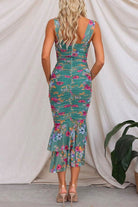 Margovil Mesh Overlay Ruched Floral Bodycon Midi Cami Dress