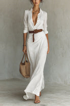 Discover timeless elegance with the Margovil Lapel Long Sleeves Button Up Maxi Dress. Crafted with a sleek lapel collar and a flattering belt, this dress accentuates your waist for a polished silhouette. The long sleeves and button-up design offer versatile style and comfortable coverage, making it perfect for both workdays and special occasions. Flowing gracefully to the floor, this maxi dress blends sophistication with effortless charm, helping you stand out with confidence wherever you wear it.