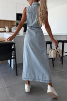 Margovil Sleeveless Button Down Tie Waist Pocketed Denim Midi Dress