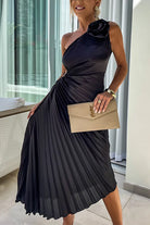 Margovil 3D Rose One Shoulder Cut Out Waist Asymmetric Hem Pleated Maxi Dress
