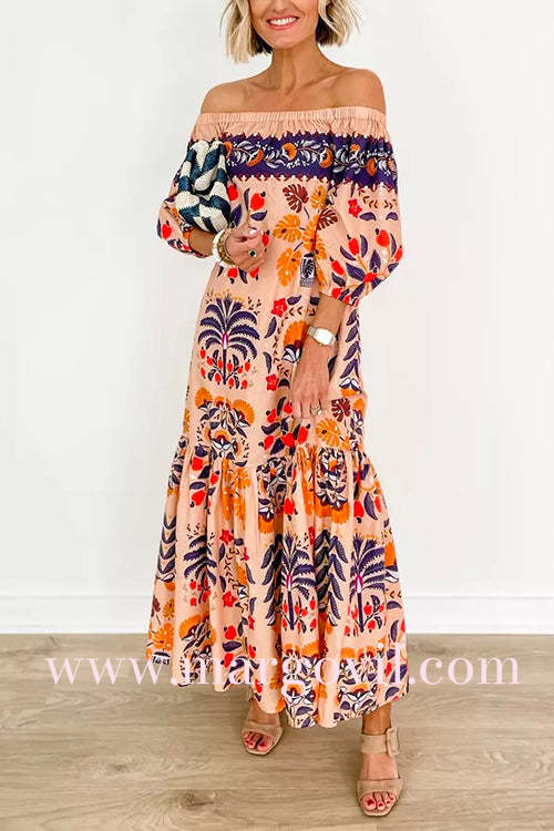 Margovil Off Shoulder Lantern Sleeves Printed Ruffle Maxi Dress